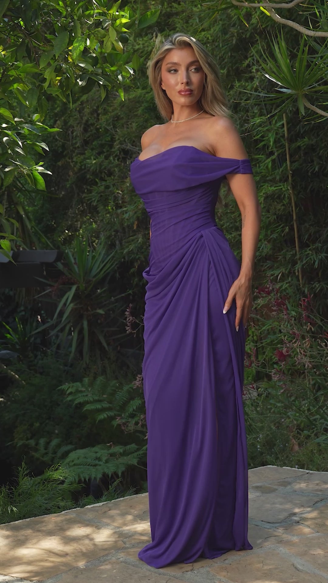 Elegante vestido de hombros descubiertos escote suavemente drapeado y un corpiño fruncido , espalda con cordones ajustables